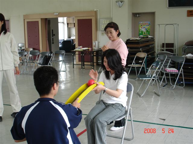 | これは補助具(ランプ)を使用した場合を体験した様子です。補助具を使用すれば、障害を抱えていてもこのスポーツを楽しむ事が出来るのです。微妙な角度や方向をアシスタントに指示して動かして貰いますが、アシスタントは後ろを見てはいけないし、しゃべってもいけません。道具の一部と化すのです。つい、振り向いたりしてしまいそうですが、そんなことをしたらなんと、ペナルテイを取られてしまいます! |