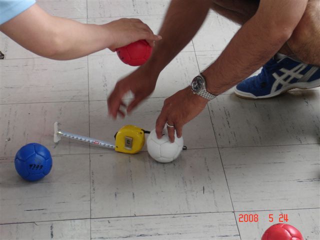 | 投げたボールに対する審判の判定風景です。この場合は白に対して赤が1個近いので、赤1点で勝ちとなります。微妙な場合はきっちり計測します!妥協はありませんよ!! |