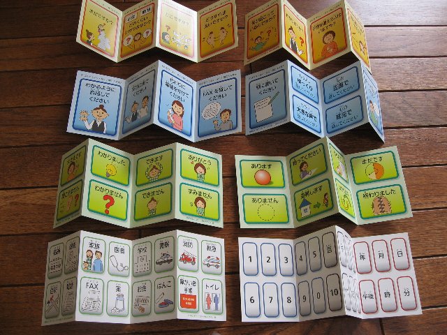 | 「指さし会話カード」は、こんな非常時にこそ、手話通訳者の方の手が廻らないであろう今こそ、「何が起こっているのですか?」「紙に書いてください」「わかりました」「わかりません」・・・・・と使えるのに、お役に立ちたい、と思ったのでした。すぐにわが家に帰れると思って、着の身着のままで避難された方々にとって、「指さし会話カード」はひょっとしたら生命線(唯一のコミュニケーション手段)となるかもしれないのに、と思ったのでした。 |