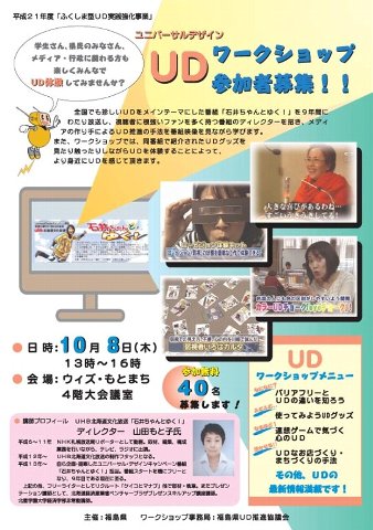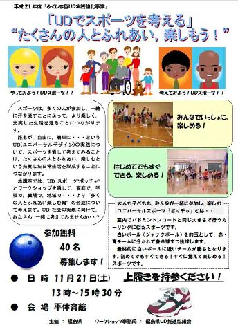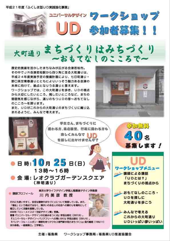会津地方 日時:平成21年10月25日(土)13:30~16時 場所:会津若松市 七日町通り 内容:「おもてなしの心」テーマにUD検証・ワークショップ 講師:川内美彦東洋大教授 浜通り 日時:平成21年11月21日(土) 場所:いわき市 内容:[ユニバーサルスポーツ ボッチャ体験] 講師:ユニバーサルスポーツ研究会