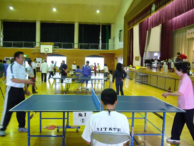 『思いやりまでいラリーピンポン大会』は、およそ130名の参加者により開催されました。個人参加はもとより、親子、夫婦な ど、年齢・性別を問わず、又、村外からも多数の参加者が集い、まさにUDスポーツにふさわしい大会になりました。この大会の特徴は、その名称のごとく、いかに相手を思いやって打ちやすい球を返し、長くラリーが続くか…を競うところにあります。技術的に強い人が勝利する訳では無いのです。だからこそ、小さな