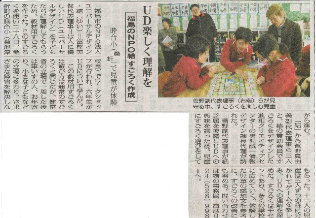 会員の佐藤俊子さんは以前、中学校の教師をされていました。その佐藤さんの教え子が、伊達郡桑折町の睦合小学校で先生を務められているということで、このすごろくゲームを紹介していただき、6年生の体験授業に、さっそくおじゃましました。 |